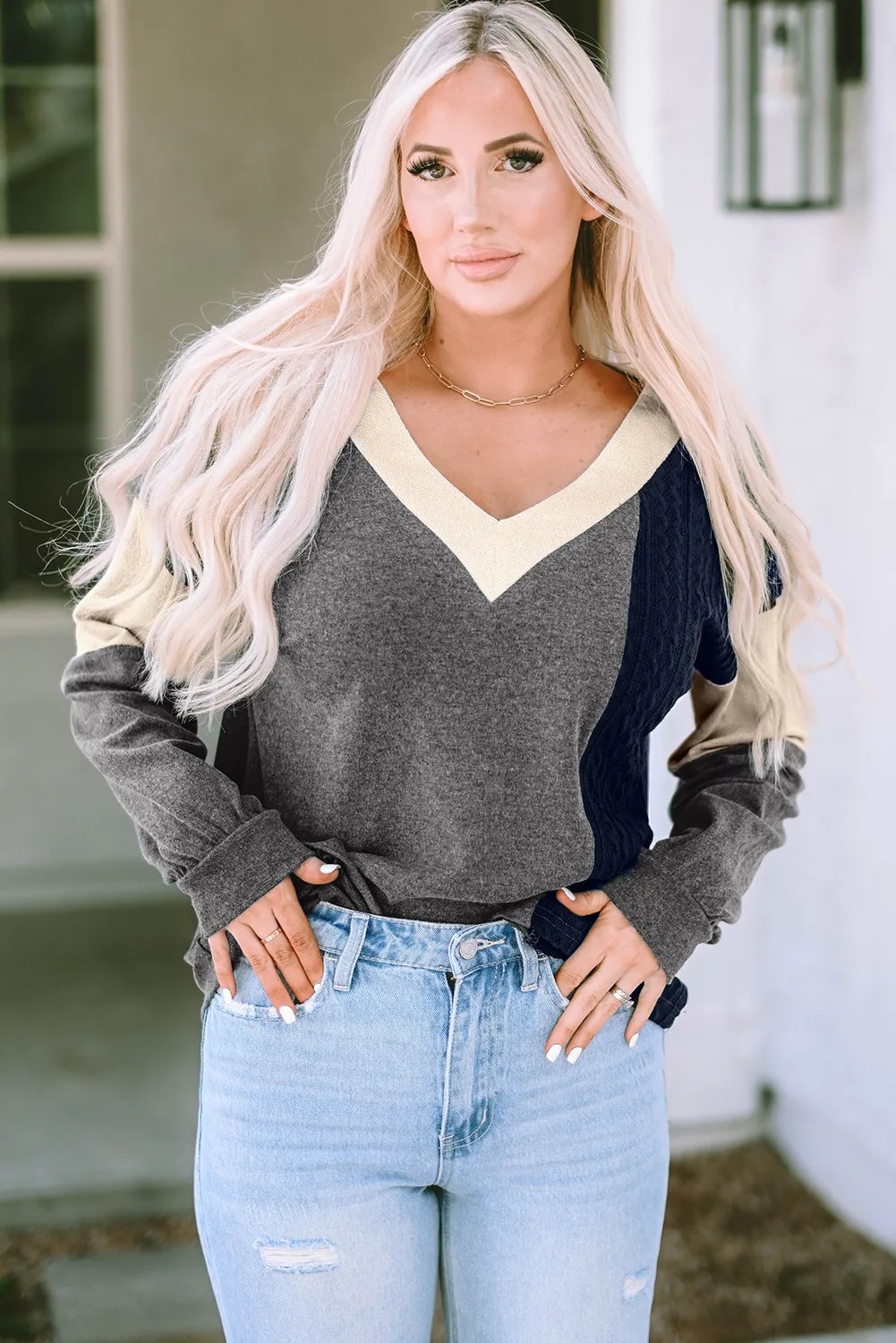 Haut à manches longues et col en V en tricot contrasté brossé noir
